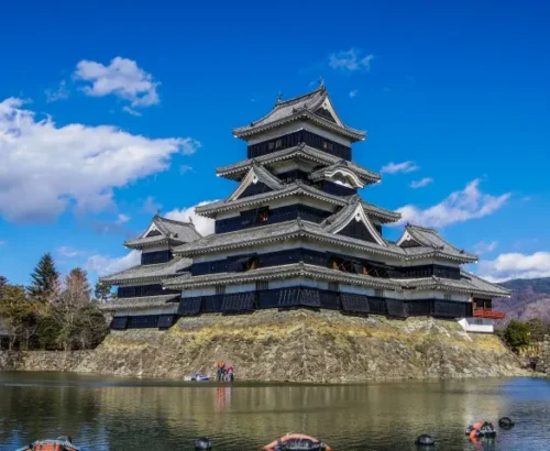 Ubicado en Nagano, este castillo, también conocido como «Castillo del Cuervo» por su color negro, es uno de los castillos más antiguos y mejor conservados de Japón. Su imponente torre de cinco pisos, que se alza sobre un foso deagua, ha sido testigo de la historia feudal japonesa y conservagran parte de su estructura original.