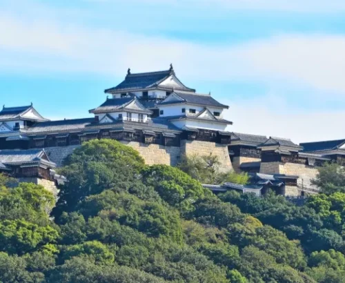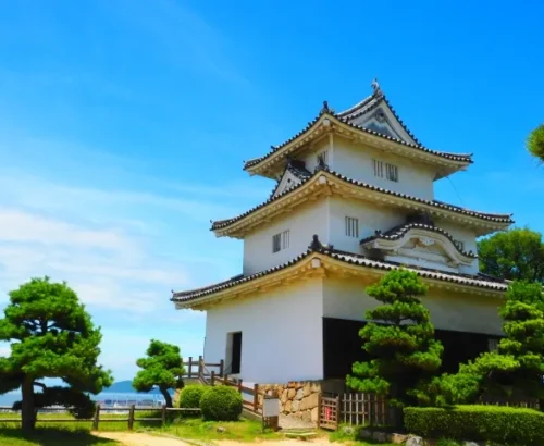 Este pequeño castillo es conocido por su torre única y su ubicación pintoresca. Ubicado en Kagawa, y a pesar de s tamaño, el castillo ofrece unas vistas espectaculares de la ciudad y sus alrededores, lo que lo hace perfecto para