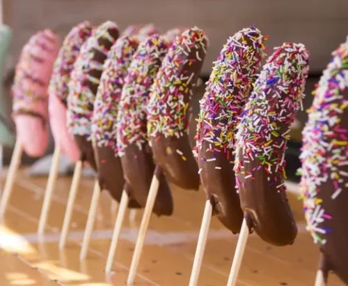 Un postre sencillo pero irresistible que puede traer recuerdos de la infancia. Se trata de los clásicos plátanos cubiertos con chocolate derretido, a menudo decorados con chispas de colores o algún otro topping. Son muy populares en festivales y puestos callejeros, y ofrecen una opción dulce, refrescante y divertida para todas las edades.