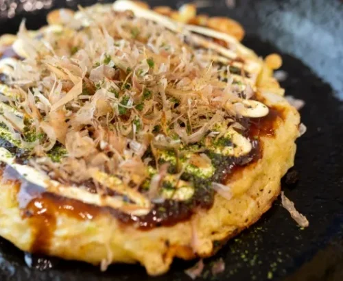 El Okonomiyaki es una especie de panqueque japonés salado, con repollo, carne, mariscos y fideos, todo cocinado a la parrilla y cubierto con una salsa especial y mayonesa. Es un platillo muy versátil y personalizable, lo que le da su nombre: okonomi significa «a tu gusto». Una de las versiones más populares es el Okonomiyaki de Hiroshima, conocido por llevar capas de ingredientes, incluyendo una porción generosa de fideos yakisoba.