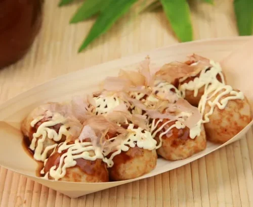 El popular Takoyaki son bolitas de masa rellenas de pulpo, cocinadas en moldes especiales de hierro que les dan su forma redonda característica. Se sirve calientes, cubiertas con una salsa dulce, mayonesa y hojuelas de bonito seco, llamadas Katsuobushi, que parecen moverse por el calor, ¡como si tuvieran vida propia! Crujientes por fuera y suaves por dentro, son un auténtico manjar originario de Osaka, y uno de los bocados callejeros más queridos de Japón.