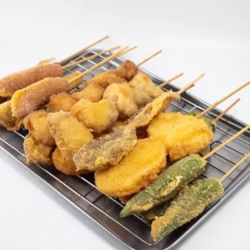 El kushikatsu son brochetas de carne, mariscos o verduras empanadas y fritas. Se sirven acompañadas de una salsa especial para mojar. Este platillo es especialmente popular en el distrito de Shinsekai.