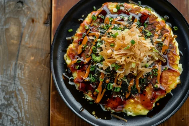 Otro de los platillos populares de Osaka es el okonomiyaki, que puede describirse como una especie de tortilla o hot cake salado. La mezcla de harina de trigo, huevo y caldo de pescado «dashi», al cocinarse en la plancha, toma esta apariencia. Suele llevar col, carne o mariscos, bañados con una salsa un poco dulce, mayonesa, aonori y katsuobushi.